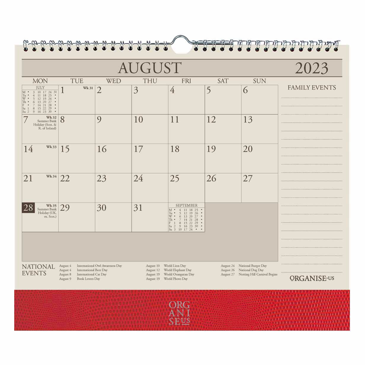 The OrganiseherTM 17 month Wall Calendar 2023 2025 in Red Lizard